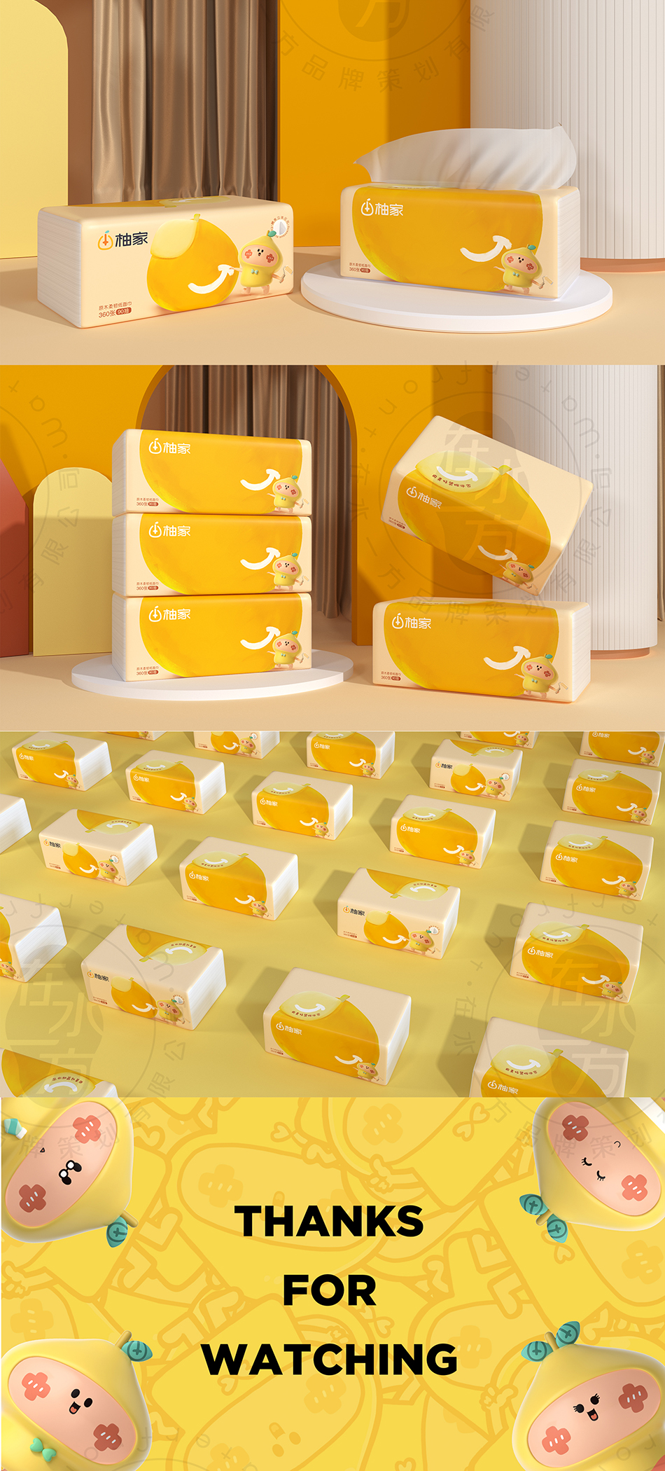 服務(wù)方案:進(jìn)入2.0時代的柚家,擁有更為明確的品牌定位路線,以迎合精致家居消費(fèi)為導(dǎo)向,全力推出一系列符合新消費(fèi)市場的優(yōu)質(zhì)紙品。放大“家”的概念,引進(jìn)柚子家族IP形象詮釋品牌對潔居生活的理解,用更為時尚有趣的方式展現(xiàn)健康品質(zhì),有助于品牌順利出圈。
