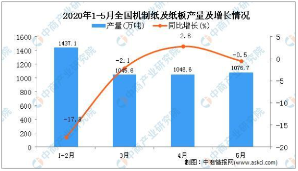 根據(jù)中國(guó)輕工業(yè)信息中心數(shù)據(jù)顯示,2020年1-5月,全國(guó)機(jī)制紙及紙板產(chǎn)量4636.2萬(wàn)噸,同比下降6.8%。5月當(dāng)月,全國(guó)機(jī)制紙及紙板產(chǎn)量1076.7萬(wàn)噸,同比下降0.5%。