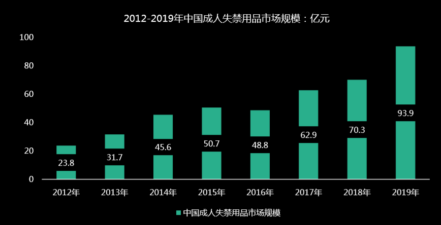 根據(jù)人口失禁發(fā)生率和人口結(jié)構(gòu)估算,中國失禁的人數(shù)在2-3億人,按照每人正常使用片單數(shù)去核算,這個(gè)群體的失禁用品規(guī)模應(yīng)該是現(xiàn)在實(shí)際的4-5倍(2019年中國成人失禁用品市場規(guī)模為93.9億元),這還是保守估算的結(jié)果。