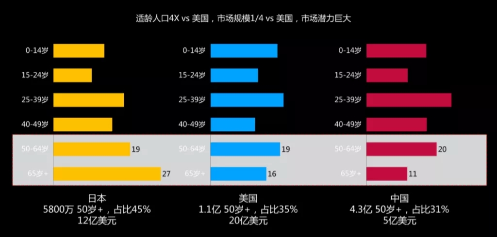 舉個(gè)例子,2017年中國50+人口是4.3億人,是美國同年50+人口的4倍(美國為1.1億),但是2017年中國中老年護(hù)理行業(yè)市場規(guī)模為5億美元,美國為20億美元。中國還有多大的市場潛力沒有釋放出來?