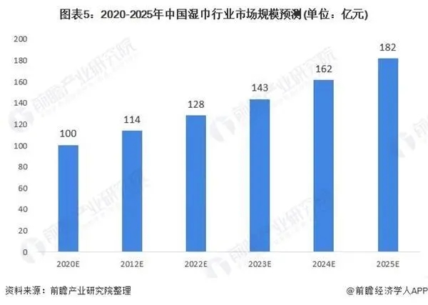 另一方面,2019年底全國(guó)疫情的爆發(fā)極大地刺激了濕巾的消費(fèi)需求。2020年1-5月,阿里濕巾線上銷售額均在1億元左右,2020年4月銷售額更是高達(dá)1.32億元,2020年2月環(huán)比增速達(dá)到113.63%。此次“新冠疫情”較2003年非典更加嚴(yán)重,進(jìn)一步激化了國(guó)人對(duì)衛(wèi)生健康的關(guān)注。同時(shí),隨著我國(guó)經(jīng)濟(jì)積極向好,居民消費(fèi)能力及意愿不斷提升,企業(yè)不斷探索制造多元化的濕巾,后疫情時(shí)代我國(guó)濕巾行業(yè)發(fā)展前景更為明朗,預(yù)計(jì)2025年市場(chǎng)規(guī)模有望達(dá)到182億元。