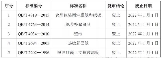 工業(yè)和信息化部2020年12月31日發(fā)布公告(中華人民共和國工業(yè)和信息化部公告2020年第51號),公告了一批行業(yè)標(biāo)準(zhǔn)的復(fù)審結(jié)論。其中,QB/T 4819—2015《食品包裝用淋膜紙和紙板》等五項(xiàng)造紙行業(yè)標(biāo)準(zhǔn)予以廢止,廢止日期均為2022年1月1日。具體情況如下: