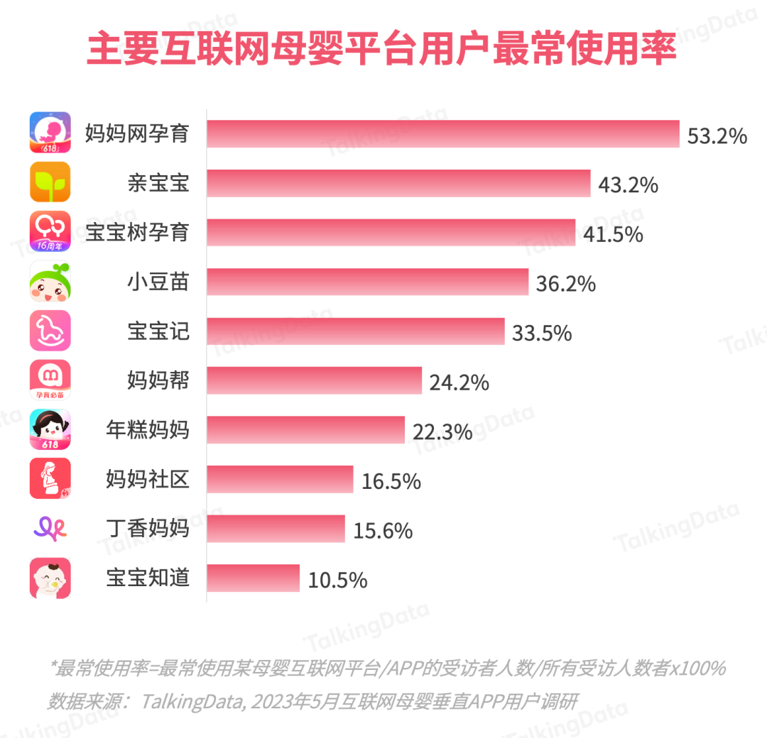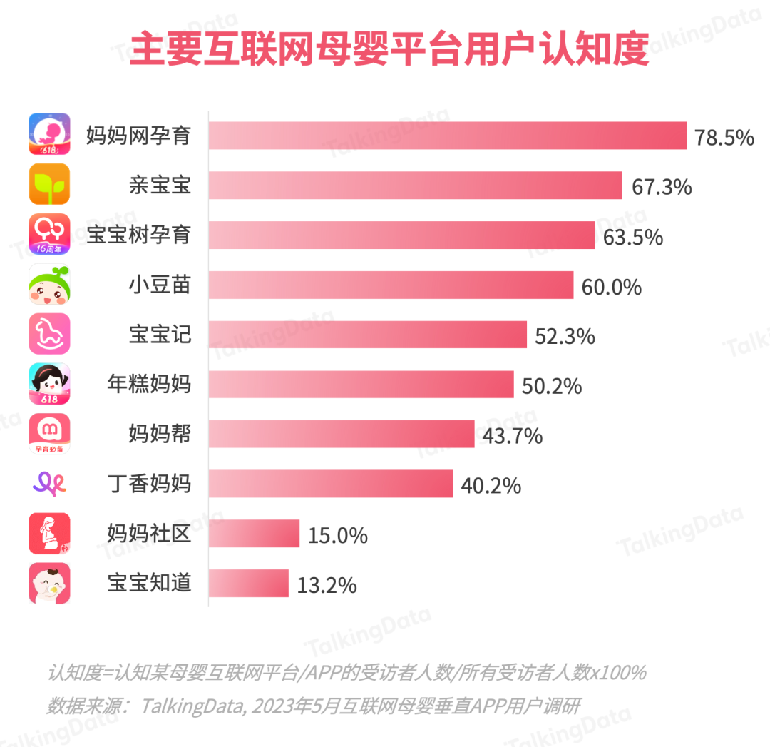 基于TalkingData的母嬰行業(yè)應(yīng)用數(shù)據(jù)及2023 年5月的調(diào)研數(shù)據(jù),報告對主要互聯(lián)網(wǎng)母嬰平臺的月活、認知、使用等數(shù)據(jù)進行了統(tǒng)計分析。