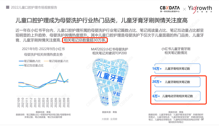 在此背景下,一場兒童口腔健康“保衛(wèi)戰(zhàn)”,在年輕育兒家庭中開始打響。從《兒童口腔護理市場觀察報告》中獲悉,在小紅書平臺內(nèi),兒童口腔護理所屬的母嬰洗護行業(yè)筆記篇數(shù)占比、筆記閱讀量占比、筆記互動量占比都呈現(xiàn)明顯的上升趨勢。