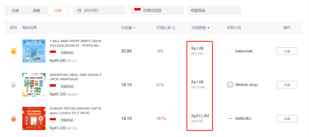 3月- Top1的商品為兒童紙尿褲,月銷量為20.8K,月銷售額為72.6K(美金)月增長率為-8%,Top2的商品是紙尿褲組合,月銷量為26.2K,銷售額為87.8K(美金)月增長率為62%,Top3的商品為紙尿褲,月銷量為16.1K,月銷售額為54.4K(美金)月增長率為347%。
