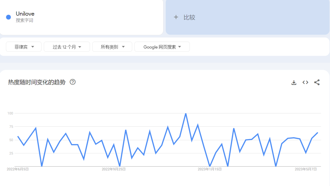 通過Google Trends我們可以了解到一定時期內(nèi),產(chǎn)品關(guān)鍵詞在搜索引擎上的搜索熱度和市場趨勢。從下方搜索趨勢不難看出,菲律賓地區(qū)在2022年全年關(guān)于“unilove”的搜索熱度平穩(wěn),并且在2023年3-4月有上升趨勢,從搜索趨勢上可以看出,unilove在菲律賓市場形成了穩(wěn)定的品牌曝光。