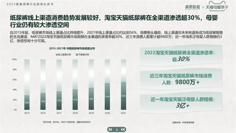 截止2021年,一半以上的紙尿褲都是由線上渠道賣出,消費勢頭強勢。近三年消費人數(shù)累計超9800萬,近一年淘系泛母嬰人群已有3億+規(guī)模。