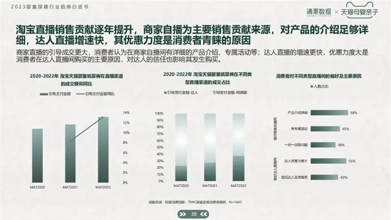 不僅如此,像淘寶等購買平臺,通過直播銷售所貢獻的購買量也在逐步上升:商家直播的引導(dǎo)成交更大,消費者認為在商家自播間有詳細的產(chǎn)品介紹、專屬活動等;達人直播的增速更快,優(yōu)惠力度大是消費者在達人直播間購買的主要原因,對達人的信任也影響其發(fā)生購買。