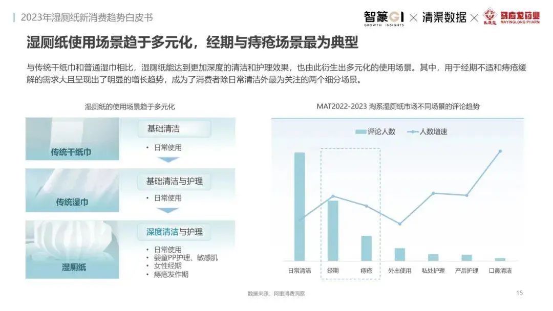 淘系濕廁紙品類(lèi)近三年的消費(fèi)金額持續(xù)增長(zhǎng),增幅遠(yuǎn)超衛(wèi)生用紙整體市場(chǎng),其中,天貓官旗的消費(fèi)責(zé)獻(xiàn)占主陣地,MAT2023占淘系年度消費(fèi)的六成以上,市場(chǎng)規(guī)模的擴(kuò)張主要來(lái)自消費(fèi)人數(shù)的增長(zhǎng),有越來(lái)越多的新客涌入,共同推動(dòng)溫廁紙的全民風(fēng)潮,同時(shí),消費(fèi)者的使用習(xí)慣養(yǎng)成,復(fù)購(gòu)意愿顯現(xiàn),消費(fèi)頻次也達(dá)到衛(wèi)生用紙整體的增速。