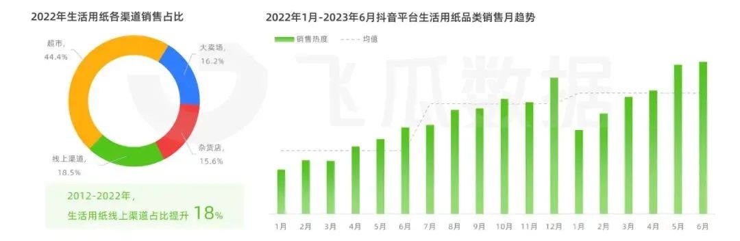 不可否認(rèn),從現(xiàn)階段分渠道來看,線下商超仍是人們購買生活用紙的首要渠道,22年銷售占比超過44%。