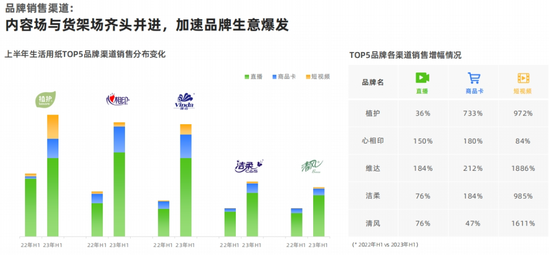 根據(jù)去年生活用紙TOP5品牌渠道銷售增幅變化數(shù)據(jù)顯示,相較于其他渠道方式,直播帶貨銷售額總體上較22年增長(zhǎng)額最大,最高可達(dá)至184%,內(nèi)容場(chǎng)與貨架場(chǎng)齊頭并進(jìn),加速品牌生意爆發(fā)。