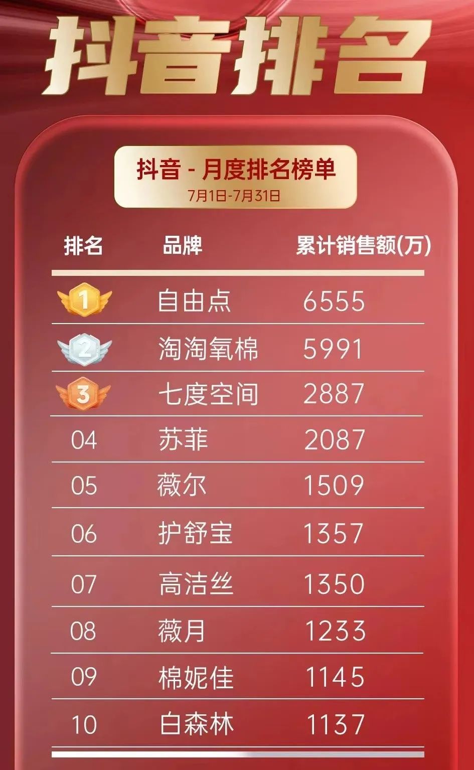 根據(jù)第三方數(shù)據(jù)平臺顯示,抖音平臺2024年7月份衛(wèi)生巾前十銷售榜單,其中,“自由點”品牌以6555萬元的銷售額高居榜首,展現(xiàn)出了強大的市場號召力和消費者認(rèn)可度。