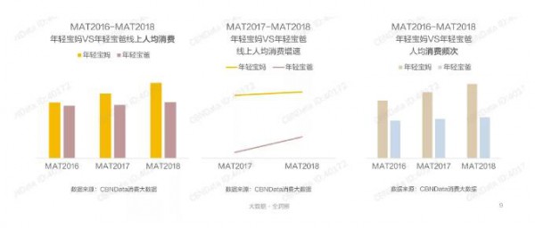 在更為開放、富足的環(huán)境下成長起來的80、90后年輕一代,大多受過良好的教育,生活水平也有所提高,他們在育兒觀念上更加開放,在包括紙尿褲在內的眾多母嬰用品上,年輕寶爸寶媽更舍得花錢,他們有強烈的消費意愿,還具備足夠的支付能力,成為母嬰消費市場的中堅力量。數據顯示,近年來,年輕寶媽寶爸的線上人均消費逐年提升。相比寶爸,寶媽的增速更快,達到兩位數的高速增長,消費潛力巨大。從消費頻次來看,年輕寶媽更愛剁手,他們的消費頻次遠高于寶爸。